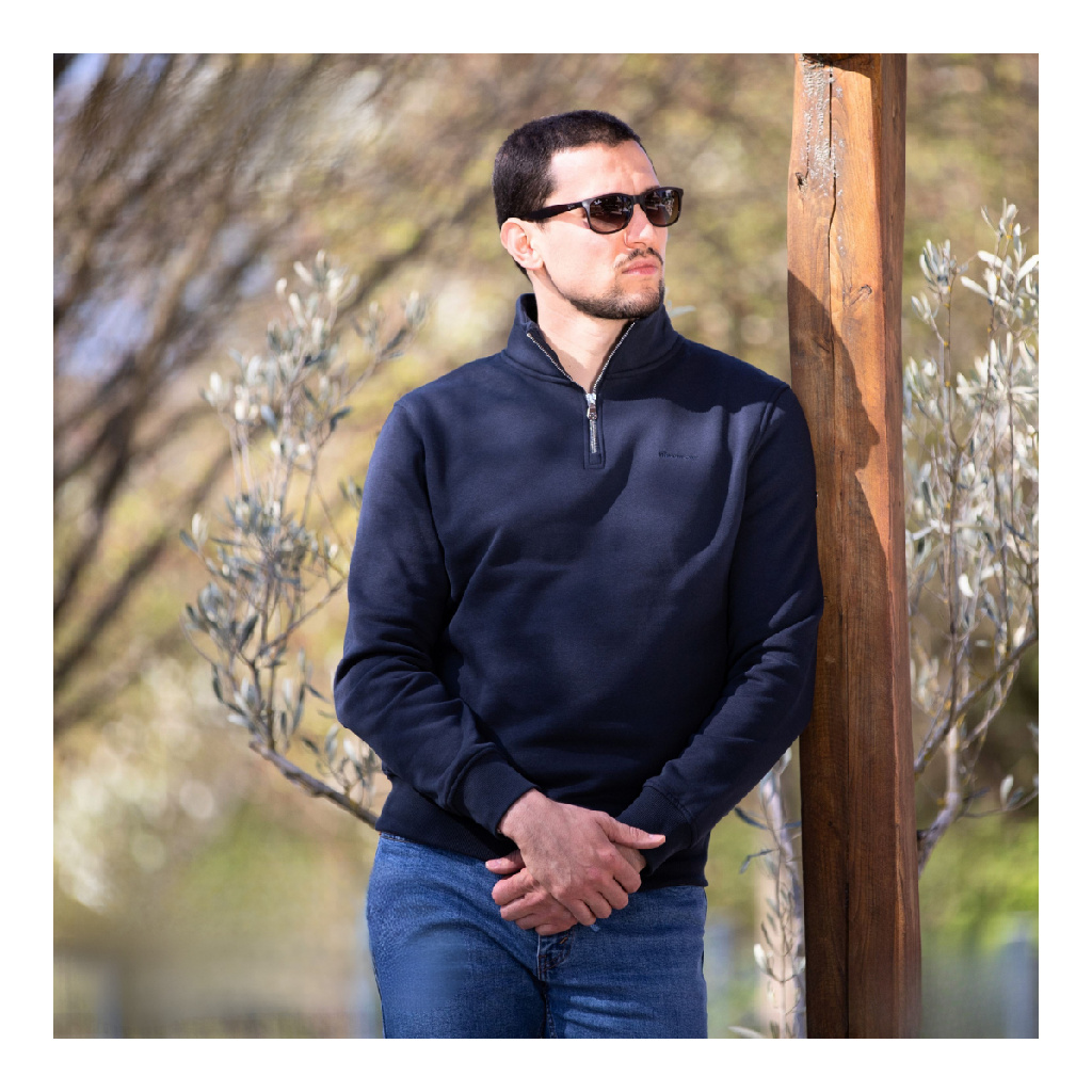 Pulovr s límcem a krátkým zipem. Vypadá upraveněji než klasická mikina a díky zipu se snadno přizpůsobí teplotě.